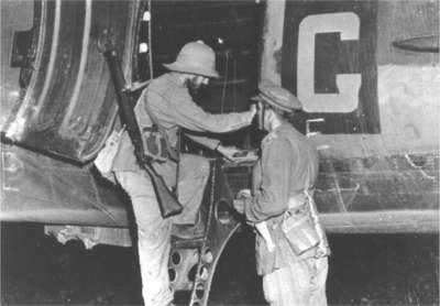 General Orde Wingate boarding a RAF 194 Squadron Dakota after visiting the 'White City' stronghold. Saying farewell is Brigadier Michael Calvert.